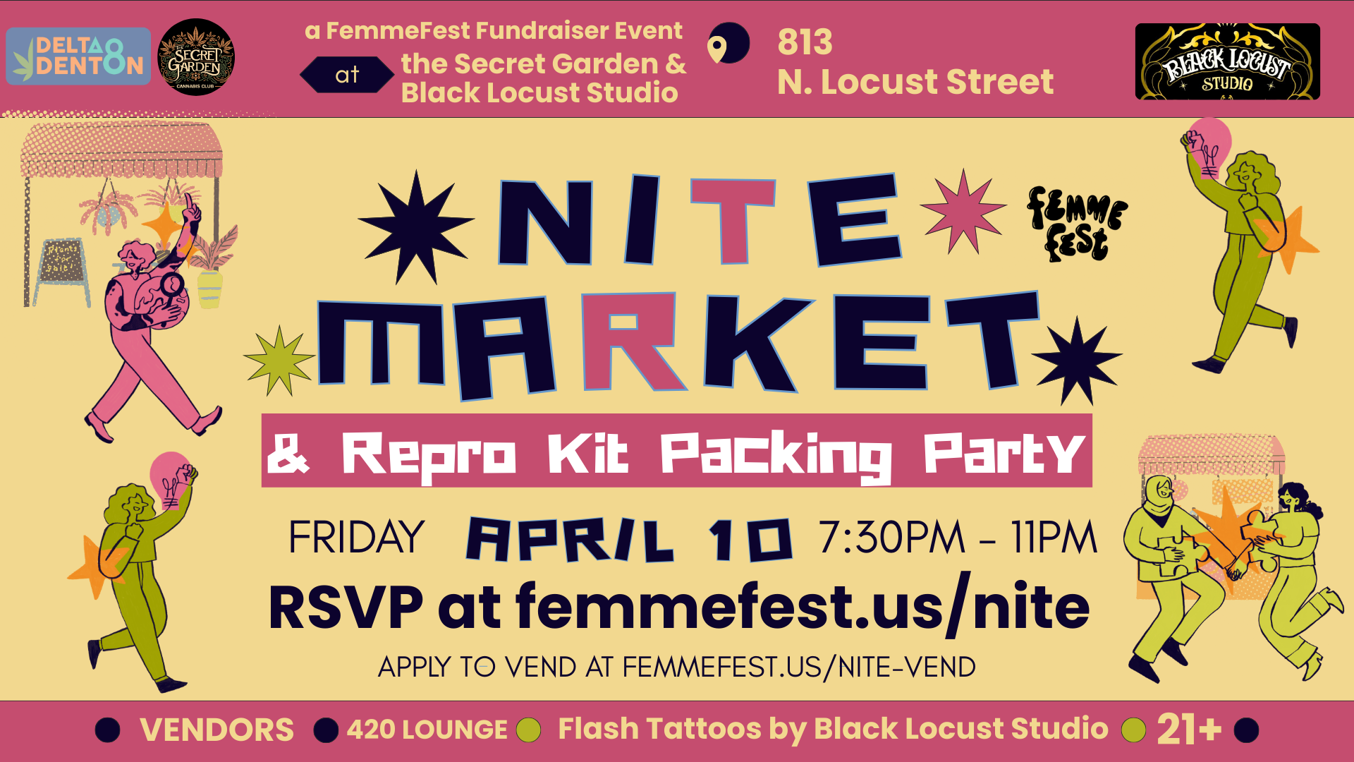 See you at Black Locust Studio and the Secret Garden for a night of vendors, herbal remedies, music, flash tattoos and raffles as we raise $1k for FemmeFest ‘26, happening September 10-13 in Downtown Denton. We’ll also be packing repro care kits for Texas Equal Access Fund’s FREE repro kit care program.